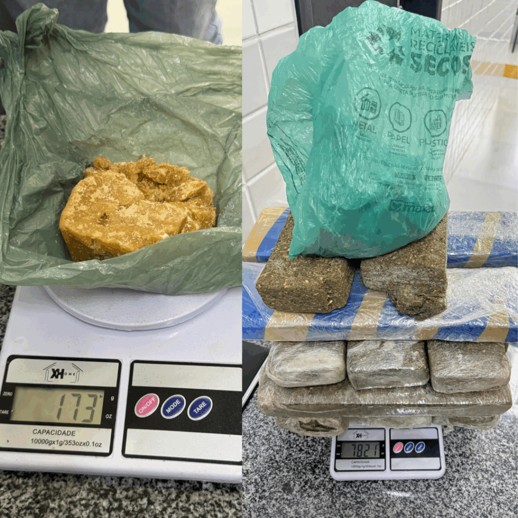 Em uma busca mais detalhada, os agentes encontraram ainda 14 tabletes de maconha, que juntos somavam aproximadamente 8 quilos da substância. Também foram apreendidos três aparelhos celulares da marca Motorola, todos danificados, e uma balança de precisão — material frequentemente utilizado no fracionamento e pesagem de drogas.